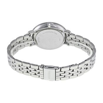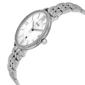 Stainless steel case with a stainless steel bracelet set with crystals. Fixed stainless steel bezel set with crystals. Silver dial with silver-toned hands and index hour markers. Roman numerals mark the 3, 6, 9 and 12 o'clock positions. Minute markers around the outer rim. Dial Type: Analog. Date display at the 6 o'clock position. Quartz movement. Scratch resistant mineral crystal. Pull / push crown. Solid case back. Case diameter: 36 mm. Case thickness: 8 mm. Round case shape. Band width: 14 mm. Fold over clasp with a push button release. Water resistant at 30 meters / 100 feet. Functions: date, hour, minute, second. Additional Info: 110 clear stones. Dress watch style. Fossil Jacqueline Silver Dial Stainless Steel Ladies Watch ES3545.