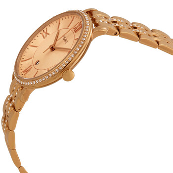 Rose gold-plated stainless steel case with a rose gold-plated stainless steel bracelet set with crystals. Fixed rose gold-plated bezel set with crystals. Rose dial with rose gold-tone hands and index hour markers. Roman numerals mark the 3, 6, 9 and 12 o'clock positions. Minute markers around the outer rim. Dial Type: Analog. Date display above the 6 o'clock position. Quartz movement. Scratch resistant mineral crystal. Pull / push crown. Solid case back. Case diameter: 36 mm. Case thickness: 8 mm. Round case shape. Band width: 14 mm. Deployment clasp. Water resistant at 30 meters / 100 feet. Functions: date, hour, minute. Dress watch style. Fossil Jaqueline Rose Dial Rose Gold-plated Ladies Watch ES3546.