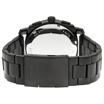 Black ion-plated stainless steel case and bracelet. Fixed black ion-plated bezel. Black dial with luminous hands and index hour markers. Minute markers around the outer rim. Dial Type: Analog. Luminescent hands and markers. Date display between the 4 and 5 o'clock positions. Chronograph - three sub-dials displaying: 60 seconds, 60 minutes and 24 hours. Quartz movement. Scratch resistant mineral crystal. Solid case back. Case diameter: 45 mm. Case thickness: 11 mm. Round case shape. Bracelet width: 24 mm. Fold over clasp. Water resistant at 50 meters / 165 feet. Functions: chronograph, date, hour, minute, second. Casual watch style. Item Variations: 691464571498. Fossil Machine Chronograph Black Ion-plated Men's Watch FS4552.