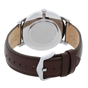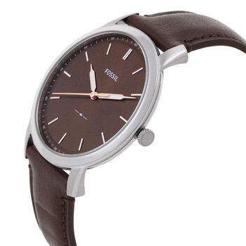 Silver-tone stainless steel case with a brown leather strap. Fixed silver-tone stainless steel bezel. Brown dial with rose gold-tone hands and index hour markers. Minute markers around the outer rim. Dial Type: Analog. Quartz movement. Scratch resistant mineral crystal. Pull / push crown. Solid case back. Round case shape, case size: 44 mm. Band width: 22 mm. Buckle clasp. Water resistant at 50 meters / 165 feet. Functions: hour, minute, second. Minimalist Series. Casual watch style. Fossil Minimalist Quartz Brown Dial Men's Watch and Bracelet Box Set FS6019SET.