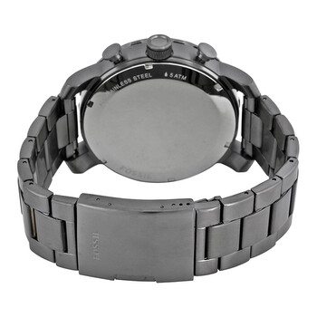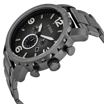 Smoke ion-plated stainless steel case and bracelet. Fixed smoke ion-plated bezel. Smoke grey dial with luminous hands and index hour markers. Arabic numerals mark the 3, 6, 9 and 12 o'clock position. Minute markers around the outer rim. Dial Type: Analog. Luminescent hands and markers. Date display at the 4 o'clock position. Chronograph - three sub-dials displaying: 60 second, 30 minute and 24 hour. Quartz movement. Scratch resistant mineral crystal. Solid case back. Case diameter: 50 mm. Round case shape. Band width: 24 mm. Fold over clasp. Water resistant at 50 meters / 165 feet. Functions: chronograph, date, hour, minute, second. Casual watch style. Fossil Nate Chronograph Smoke Grey Dial Ion-plated Men's Watch JR1437.