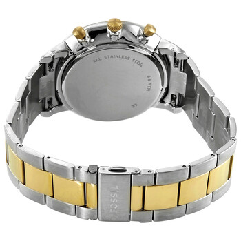Stainless steel case with a two-tone (silver-tone and yellow gold-tone) stainless steel bracelet. Fixed yellow gold-tone bezel. Blue dial with luminous yellow gold-tone hands and index hour markers. Arabic numeral minute markers (at 5 minute intervals). Minute markers around the outer rim. Dial Type: Analog. Luminescent hands. Date display between 4 and 5 o'clock position. Quartz movement. Scratch resistant mineral crystal. Pull / push crown. Solid case back. Round case shape. Case size: 44 mm. Case thickness: 1`2 mm. Band width: 22 mm. Fold over clasp. Water resistant at 50 meters / 165 feet. Functions: chronograph, date, hour, minute, second. Neutra Series. Casual watch style. Watch label: Japan Movt. Fossil Neutra Chronograph Quartz Blue Dial Men's Watch FS5706.