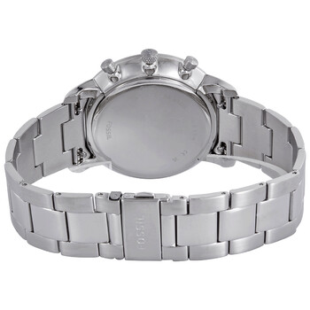 Stainless steel case with a stainless steel bracelet. Fixed stainless steel bezel. Blue dial with luminous silver-tone hands and index hour markers. Roman numeral at 6 and 12 o clock positions. Arabic numeral minute markers (at 5 minute intervals). Minute markers around the outer rim. Dial Type: Analog. Luminescent hands and markers. Date display between the 4 and 5 o'clock positions. Chronograph - three sub-dials displaying: 60 second, 60 minute and 24 hour. Quartz movement. Scratch resistant mineral crystal. Pull / push crown. Solid case back. Round case shape. Case size: 44 mm. Case thickness: 12 mm. Band width: 22 mm. Deployment clasp with a push button release. Water resistant at 50 meters / 165 feet. Functions: chronograph, date, hour, minute, second. Neutra Series. Casual watch style. Watch label: Japan Movt. Fossil Neutra Chronograph Quartz Blue Dial Men's Watch FS5792.
