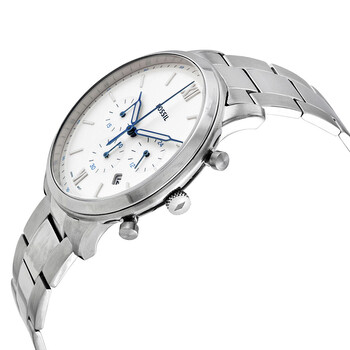 Stainless steel case with a stainless steel bracelet. Fixed stainless steel bezel. White dial with luminous blue hands and index hour markers. Arabic numeral minute markers (at 5 minute intervals). Minute markers around the outer rim. Dial Type: Analog. Luminescent hands and markers. Date display between the 4 and 5 o'clock positions. Chronograph - three sub-dials displaying: 60 second, 30 minute and 24 hour. Quartz movement. Scratch resistant mineral crystal. Pull / push crown. Solid case back. Round case shape. Case size: 44 mm. Case thickness: 12 mm. Band width: 22 mm. Fold over clasp with a push button release. Water resistant at 50 meters / 165 feet. Functions: chronograph, date, hour, minute, second. Neutra Series. Dress watch style. Watch label: Japan Movt. Fossil Neutra Chronograph Quartz White Dial Men's Watch FS5433.