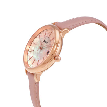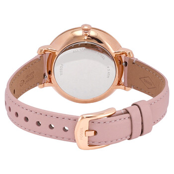 Rose gold-tone stainless steel case with a pink leather strap. Fixed rose gold-tone bezel. Pink mother of pearl dial with rose gold-tone hands and index hour markers. Minute markers around the outer rim. Dial Type: Analog. Date display at the 3 o'clock position. Quartz movement. Scratch resistant mineral crystal. Pull / push crown. Solid case back. Round case shape. Case size: 36 mm. Case thickness: 10 mm. Band width: 14 mm. Tang clasp. Water resistant at 30 meters / 100 feet. Functions: date, hour, minute, second. Pro-planet Jacqueline Series. Dress watch style. Fossil Pro-Planet Jacqueline Solar Powered Quartz Ladies Watch ES5092.