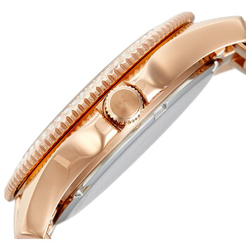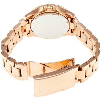 Rose gold-tone stainless steel case and bracelet. Fixed rose gold-tone bezel set with 120 crystals. R0se dial with luminous rose gold-tone hands and index hour markers. Minute markers around the outer rim. Dial Type: Analog. Luminescent hands and markers. Date display at the 3 o'clock position. Quartz movement. Scratch resistant mineral crystal. Pull / push crown. Solid case back. Case diameter: 36 mm. Case thickness: 11 mm. Round case shape. Band width: 18 mm. Band length: 7 inches. Fold over clasp. Water resistant at 100 meters / 330 feet. Functions: date, hour, minute, second. Casual watch style. Fossil Retro Traveler Rose Dial Rose Gold-tone Ladies Watch AM4454.