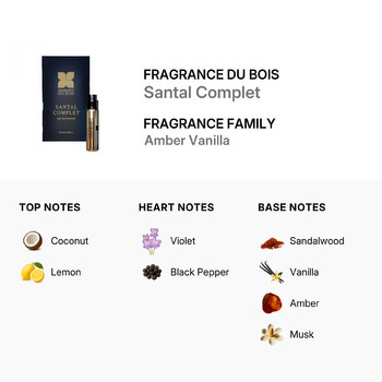 At first spray, Santal Complet opens with the tropical sweetness of coconut and a bright burst of lemon, creating a fresh and inviting introduction. As the scent settles, delicate hints of violet blend with a touch of black pepper, adding depth and a soft, spicy heart that keeps the fragrance intriguing and refined.