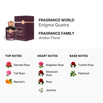 Designed by the renowned Fragrance World, a leading name in Middle Eastern fragrances, Enigma Quatre reflects the luxurious and exotic essence of the United Arab Emirates. This fragrance is perfect for ladies who appreciate the finer things in life and wish to leave a lasting impression wherever they go.