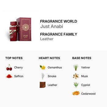 Just Anabi's top notes of cherry and saffron create an enchanting introduction, leading your senses into a world of opulence. As the fragrance unfolds, the heart notes of osmanthus, smoke, and leather provide a rich, smoky depth that is both seductive and timeless. Finally, the base notes of vetiver, musk, cypriol, and cedarwood ground the scent, leaving a lasting impression that is both sophisticated and enduring.