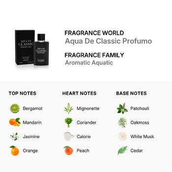 Grounding the fragrance is a smooth and masculine base of patchouli, oakmoss, white musk, cedar, and amber. These earthy tones add warmth and depth, making Aqua De Classic Profumo a perfect scent for any time of day. Whether you're heading to the office or out for the evening, this long-lasting fragrance keeps you feeling fresh and confident.