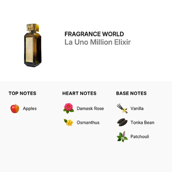 La Uno Million Elixir opens with a crisp top note of juicy apples, delivering a fresh and energetic start. As the scent evolves, heart notes of luxurious Damask rose and exotic osmanthus create a smooth and slightly sweet floral aroma that adds depth and sophistication. Finally, the fragrance settles into a rich base of creamy vanilla, warm tonka bean, and earthy patchouli, leaving a lasting impression that’s both masculine and irresistible.