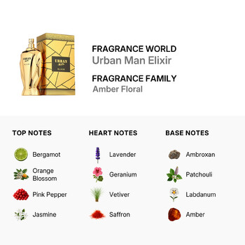 Urban Man Elixir belongs to the Amber Floral fragrance family, offering a dynamic and charismatic scent profile. The top notes open with a fresh burst of bergamot, orange blossom, pink pepper, and jasmine, creating an invigorating first impression. The heart notes blend soothing lavender, aromatic geranium, earthy vetiver, exotic saffron, and resinous elemi, building a rich and textured middle layer that is both inviting and powerful. Finally, the base notes of ambroxan, patchouli, labdanum, amber, and cedar ground the fragrance with warmth and depth, leaving a lasting trail of bold elegance.