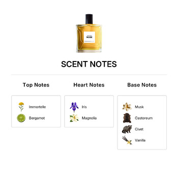 Unspoken Musk opens with a striking burst of Immortelle and fresh Bergamot, creating a warm yet lively introduction. As it settles, soft floral notes of Iris and Magnolia emerge, adding elegance and depth to the heart of the scent. The base unfolds with a sensual mix of Musk, Castoreum, Civet, and Vanilla, enhanced by creamy Sandalwood, earthy Patchouli, Tonka Bean, and exotic Cypriol Oil (Nagarmotha), delivering a smooth, musky finish that lingers beautifully on the skin.