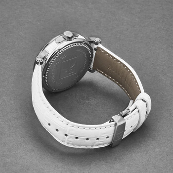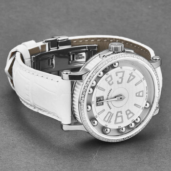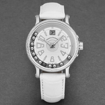 Silver-tone stainless steel case with a white leather strap. Fixed silver-tone stainless steel bezel. White dial with silver-tone hands and Arabic numeral hour markers. Dial Type: Analog. Quartz movement. Scratch resistant sapphire crystal. Pull / push crown. Solid case back. Round case shape, case size: 42 mm, case thickness: 12 mm. Band width: 20 mm, band length: 8 inches. Tang clasp. Functions: hour, minute, second. Crazy Balls Series. Luxury watch style. Watch label: Swiss Made. Franck Dubarry Crazy Balls White Dial Ladies Watch CB0308.