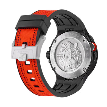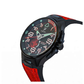 Black stainless steel case with a red rubber strap. Bi-directional rotating black stainless steel bezel. Black dial with silver-tone hands and Arabic numeral hour markers. Minute markers around the outer rim. Dial Type: Analog. Luminescent hands and markers. Automatic Open-Heart, Myota Movement automatic movement. Scratch resistant sapphire crystal. Solid case back. Round case shape, case size: 42 mm, case thickness: 13 mm. Band width: 25 mm, band length: 8 inches. Tang clasp. Water resistant at 300 meters / 1000 feet. Functions: hour, minute, second. Additional Info: components made from recycled plastics found in the oceans. Deep Ocean Series. Luxury watch style. Franck Dubarry Deep Ocean Automatic Black Dial Men's Watch 05 VIVIDRED.