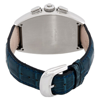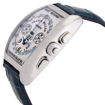 Silver-tone stainless steel case with a blue leather strap. Fixed silver-tone stainless steel bezel. Silver-tone dial with blue hands and Arabic numeral hour markers. Dial Type: Analog. Chronograph - three sub-dials displaying: 60 second, 30 minute and 12 hour. Automatic movement. Scratch resistant sapphire crystal. Pull / push crown. Solid case back. Tonneau case shape, case size: 46.5 mm, case thickness: 16 mm. Band width: 22 mm, band length: 8 inches. Buckle clasp. Water resistant at 30 meters / 100 feet. Functions: chronograph, hour, minute, second. Additional Info: hour, minute, second, split second chronograph. Casabalanca Series. Luxury watch style. Watch label: Swiss Made. Franck Muller Casabalanca Chronograph Automatic Silver Dial Men's Watch 8883CC RC AC BL.