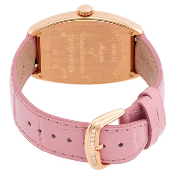 18kt rose gold case with a pink leather strap. Fixed 18kt rose gold bezel set with diamonds. White dial with rose gold-tone hands and Arabic numeral hour markers. Dial Type: Analog. Automatic movement. Scratch resistant sapphire crystal. Solid case back. Tonneau case shape, case size: 31 mm. Buckle clasp. Water resistant at 30 meters / 100 feet. Functions: hour, minute, second. Cintree Curvex Series. Luxury watch style. Watch label: Swiss Made. Item Variations: 2852 SC D 1R PINK TONES 5N. Franck Muller Cintree Curvex Automatic Diamond White Dial Watch 2852 SC D 1R PINK TONES 5N.