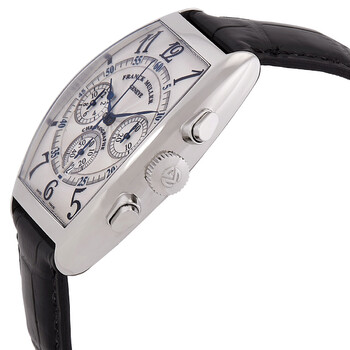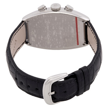 Silver-tone stainless steel case with a black leather strap. Fixed silver-tone stainless steel bezel. Index-Arabic numeral hour markers. Minute markers around the outer rim. Dial Type: Analog. Date display at the 6 o'clock position. Chronograph - three sub-dials displaying: 60 second, 30 minute and 12 hour. Automatic movement. Scratch resistant sapphire crystal. Solid case back. Tonneau case shape, case size: 34 mm. Buckle clasp. Water resistant at 30 meters / 100 feet. Functions: chronograph, date, hour, minute, second. Cintree Curvex Chronograph Series. Luxury watch style. Watch label: Swiss Made. Franck Muller Cintree Curvex Chronograph Automatic Watch 6850 CC AT AC.