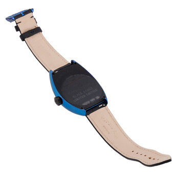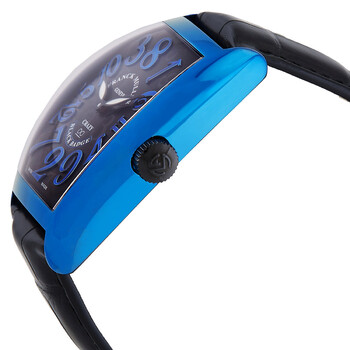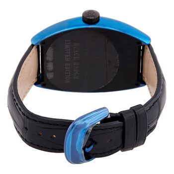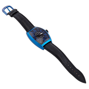 Blue PVD stainless steel case with a black alligator leather strap. Fixed blue PVD stainless steel bezel. Black dial with rose gold-tone hands and Arabic numeral hour markers. Dial Type: Analog. Luminescent hands. Automatic movement. Scratch resistant sapphire crystal. Tonneau case shape, case size: 39.6 x 55.4 mm, case thickness: 11.8 mm. Buckle clasp. Water resistant at 30 meters / 100 feet. Functions: hour, minute. Additional Info: limited edition: 116 pieces. Cintree Curvex Series. Luxury watch style. Watch label: Swiss Made. Item Variations: 8880 CH BLACK BADGE BL AC. Franck Muller Cintree Curvex Crazy Hours Automatic Black Dial Men's Watch 8880 CH BLACK BADGE BL AC.
