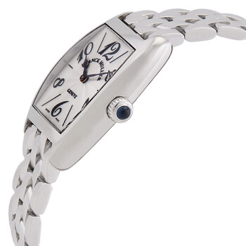 Platinum case and bracelet. Fixed platinum bezel. Silver dial with index-Arabic numeral hour markers. Dial Type: Analog. Hand wind movement. Scratch resistant sapphire crystal. Pull / push crown. Transparent see through case back. Tonneau case shape, case size: 22 mm. Water resistant at 30 meters / 100 feet. Functions: hour, minute. Cintree Curvex Series. Luxury watch style. Watch label: Swiss Made. Franck Muller Cintree Curvex Hand Wind Silver Dial Watch 2251 MC PLAT.