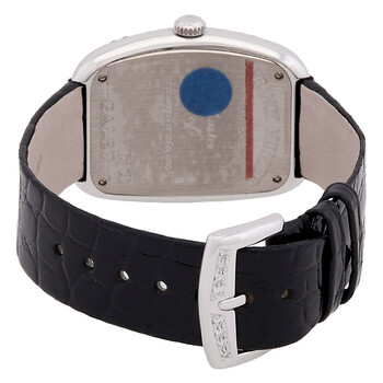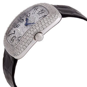 18kt white gold case with a black leather strap. Fixed bezel with diamond set 18kt white gold. Diamond set dial with blue hands and Arabic numeral hour markers. Dial Type: Analog. Quartz movement. Scratch resistant sapphire crystal. Solid case back. Rectangle case shape, case size: 29 mm. Buckle clasp. Water resistant at 30 meters / 100 feet. Functions: hour, minute. Galet Series. Luxury watch style. Watch label: Swiss Made. Franck Muller Galet Quartz Diamond Watch 3002 L QZ V D3 CD OG.