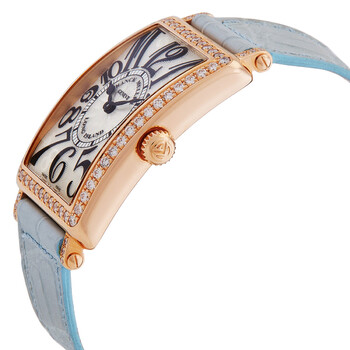 18kt rose gold case with a blue leather strap. Fixed 18kt rose gold bezel set with diamonds. White dial with black hands and Arabic numeral hour markers. Minute scale around the inner rim. Dial Type: Analog. Quartz movement. Scratch resistant sapphire crystal. Solid case back. Rectangle case shape, case size: 26 mm. Buckle clasp. Water resistant at 30 meters / 100 feet. Functions: hour, minute. Long Island Series. Luxury watch style. Watch label: Swiss Made. Item Variations: 952 QZ D 1R HO 5N. Franck Muller Long Island Quartz Diamond White Dial Unisex Watch 952 QZ D 1R HO 5N.