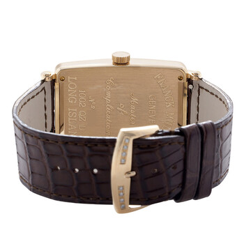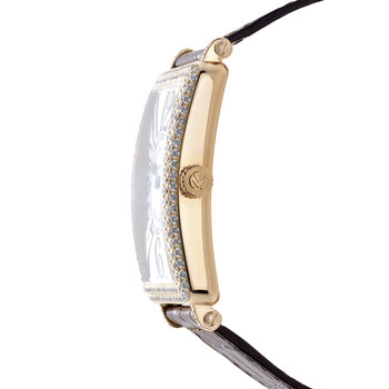 18K rose gold case is set with 152 brilliant-cut hand-set diamonds. Silvered dial emblazoned with Franck Muller’s iconic black painted Arabic numerals and an attractive stamped guilloche pattern. There is a center minute track. 18K rose gold tang buckle is set with eight brilliant-cut diamonds. The case measures 30.5 mm x 51.8 mm (including lugs) and features a solid back, push / pull winding crown, 30 m / 3 atm water resistance. The quartz-driven movement (MVT FM 2750-QZ ) delivers a three-year battery life, possesses five rubies, and runs at 32,768 Hz.