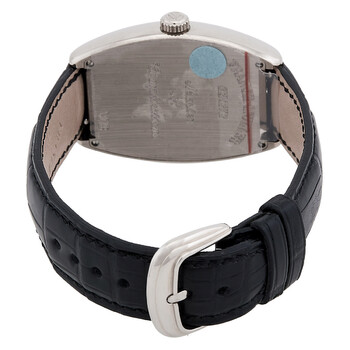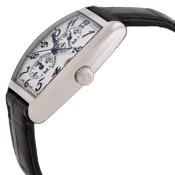 18kt white gold case with a black leather strap. Fixed 18kt white gold bezel. Silver dial with blue hands and Arabic numeral hour markers. Minute markers around the outer rim. Dial Type: Analog. Date display at the 3 o'clock position. Dual time subdials. Automatic movement. Scratch resistant sapphire crystal. Solid case back. Tonneau case shape, case size: 31 mm. Buckle clasp. Water resistant at 30 meters / 100 feet. Functions: date, hour, minute, second, dual time. Master Banker Series. Luxury watch style. Watch label: Swiss Made. Franck Muller Master Banker Automatic Silver Dial Watch 2852 MB OG.