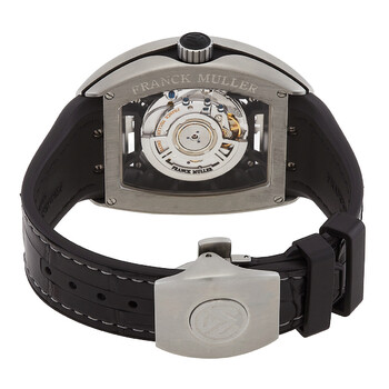 Stainless steel case with a black alligator leather and rubber strap. Fixed stainless steel bezel. Transparent and black dial with silver-tone hands and Arabic numeral hour markers. Dial Type: Analog. Luminescent hands and markers. Franck Muller Calibre FM2800-MBSC automatic movement with a 42-hour power reserve. Scratch resistant sapphire crystal. Transparent see through case back. Tonneau case shape, case size: 45 mm, case thickness: 12.7. Fold over clasp. Water resistant at 30 meters / 100 feet. Functions: hour, minute, second. Master Banker Skeleton Series. Watch label: Swiss Made. Franck Muller Master Banker Skeleton Automatic Men's Watch V 45 MB SC DT SQT AC BR NR AC.