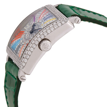 18kt white gold case with a green leather strap. Fixed diamond set 18kt white gold bezel. Diamond set dial with blue hands and Roman numeral hour markers. Minute scale around the inner rim. Dial Type: Analog. Quartz movement. Scratch resistant sapphire crystal. Pull / push crown. Solid case back. Square case shape, case size: 29 mm. Buckle clasp. Functions: hour, minute. Master Square Series. Luxury watch style. Watch label: Swiss Made. Franck Muller Master Square Quartz Diamond Watch 6002 L QZ D CD OG.