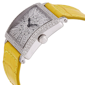 18kt white gold case with a yellow leather strap. Fixed 18kt white gold bezel with diamond set. Diamond embellished dial with black hands and index hour markers. Dial Type: Analog. Quartz movement. Solid case back. Square case shape, case size: 29 mm. Buckle clasp. Functions: hour, minute. Master Square Relief Series. Luxury watch style. Watch label: Swiss Made. Franck Muller Master Square Relief Quartz Diamond Watch 6002 L QZ R D CD OG.