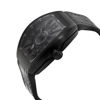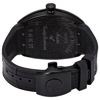 Black PVD titanium case with a black rubber strap with a black carbon fiber inlay. Fixed black PVD titanium bezel. Black dial with black hands and Arabic numeral hour markers. Minute markers. 360 degree (compass) markings around the outer rim. Dial Type: Analog. Date display above the 6 o'clock position. Caliber FM automatic movement with a 42-hour power reserve. Scratch resistant sapphire crystal. Screw down crown. Solid case back. Tonneau case shape. Case size: 45 mm. Case thickness: 14 mm. Band width: 20 mm. Band length: 8 inches. Deployment with push button release clasp. Water resistant at 30 meters / 100 feet. Functions: date, hour, minute, second. Vanguard Series. Luxury watch style. Watch label: Swiss Made. Franck Muller Vanguard Automatic Black Dial Men's Watch 45SCBLKBLKBLK.
