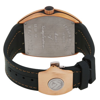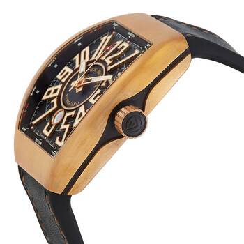 Bronze case with a black leather strap. Fixed bronze bezel. Black dial with luminous rose gold-tone hands and Arabic numeral hour markers. Minute markers. 360 degree markings around the outer rim. Dial Type: Analog. Luminescent hands and markers. Date display at the 6 o'clock position. Automatic movement. Scratch resistant sapphire crystal. Screw down crown. Solid case back. Tonneau case shape. Case dimensions: 44 mm x 53.7 mm. Case thickness: 13.42 mm. Tang clasp. Water resistant at 30 meters / 100 feet. Functions: date, hour, minute. second. Additional Info: original box, manual (complete accessories). Luxury watch style. Watch label: Swiss Made. Franck Muller Vanguard Automatic Black Dial Unisex Watch V45SCDTCIR(BZBRNR)-BK.