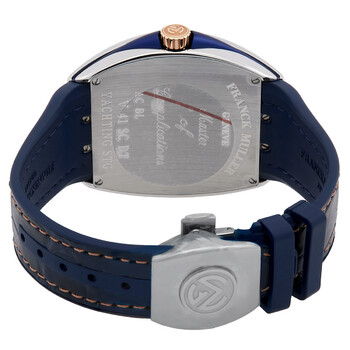Silver-tone stainless steel case with a blue leather strap. Fixed silver-tone stainless steel bezel. Blue dial with gold-tone hands and Arabic numeral hour markers. Minute markers around the outer rim. Dial Type: Analog. Luminescent hands and markers. Date display at the 6 o'clock position. Automatic movement. Scratch resistant sapphire crystal. Solid case back. Tonneau case shape, case size: 41 mm. Tang clasp. Functions: date, hour, minute, second. Additional Info: original box, international warranty card, manual (complete accessories). Vanguard Series. Luxury watch style. Watch label: Swiss Made. Franck Muller Vanguard Automatic Blue Dial Men's Watch V 41 SC DT YACHTING STG (AC.BL).