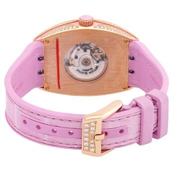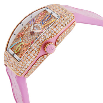 Rose gold-tone stainless steel case with a pink alligator leather strap. Fixed rose gold-tone bezel with diamond set. Diamond set dial with multi-color Arabic numeral hour markers. Dial Type: Analog. Luminescent hands. Automatic movement. Scratch resistant sapphire crystal. Transparent case back. Tonneau case shape, case size: 32 mm. Buckle clasp. Water resistant at 30 meters / 100 feet. Functions: hour, minute, second. Vanguard Series. Luxury watch style. Watch label: Swiss Made. Franck Muller Vanguard Automatic Diamond Ladies Watch V 32 SC AT FO D CD COL DR.