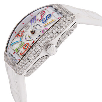 18kt white gold case with a white leather and rubber strap. Fixed 18kt white gold set bezel with diamonds. Silver dial with Arabic numeral hour markers. Dial Type: Analog. Automatic movement. Scratch resistant sapphire crystal. Solid case back. Tonneau case shape, case size: 32 mm. Buckle clasp. Water resistant at 30 meters / 100 feet. Functions: hour, minute, second. Vanguard Series. Luxury watch style. Watch label: Swiss Made. Item Variations: V 32 CH D COL DR ASIA LTD AC BCAC. Franck Muller Vanguard Automatic Diamond Silver Dial Ladies Watch V 32 CH D COL DR ASIA LTD AC BCAC.