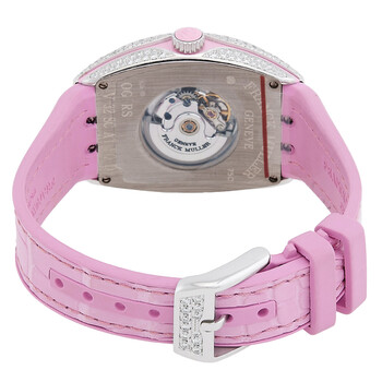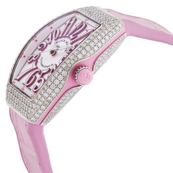 18kt white gold case with a pink leather strap. Fixed 18kt white gold set bezel with diamonds. Silver dial with silver-tone hands and Arabic numeral hour markers. Dial Type: Analog. Luminescent hands. Automatic movement. Scratch resistant sapphire crystal. Transparent case back. Tonneau case shape, case size: 32 mm. Pin buckle clasp. Water resistant at 30 meters / 100 feet. Functions: hour, minute, second. Additional Info: original box, manual (complete accessories). Vanguard Series. Luxury watch style. Item Variations: V 32 SC AT FO D OG RS WG. Franck Muller Vanguard Automatic Diamond Silver Dial Unisex Watch V 32 SC AT FO D OG RS WG.