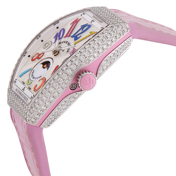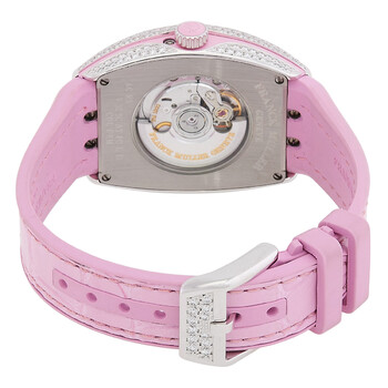 Silver-tone stainless steel case with a pink rubber strap. Fixed silver-tone stainless steel bezel set with diamonds. White dial with silver-tone hands and Arabic numeral hour markers. Dial Type: Analog. One subdial displaying: moon phase. Automatic movement. Scratch resistant sapphire crystal. Screw down crown. Transparent case back. Tonneau case shape, case size: 32 mm. Buckle clasp. Functions: hour, minute, second, moonphase. Vanguard Series. Luxury watch style. Watch label: Swiss Made. Franck Muller Vanguard Automatic Diamond White Dial Ladies Watch V 32 SC AT FO L D COL DR AC RS AC.