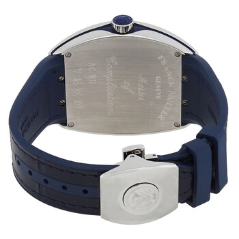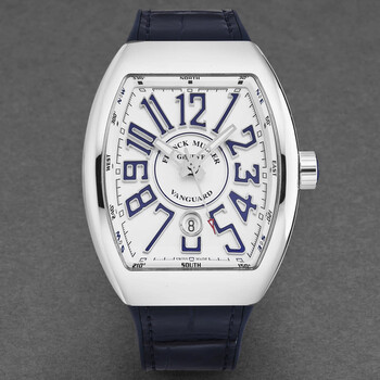Stainless steel case with a blue rubber strap. Fixed stainless steel bezel. White dial with luminous silver-tone hands and Arabic numeral hour markers. Minute markers. 360 degree (compass) markings around the outer rim. Dial Type: Analog. Luminescent hands and markers. Date display above the 6 o'clock position. Automatic movement. Scratch resistant sapphire crystal. Screw down crown. Solid case back. Tonneau case shape. Case size: 45 mm. Case thickness: 13 mm. Band width: 27 mm, band length: 8 inches. Deployment clasp with a push button release. Water resistant at 30 meters / 100 feet. Functions: date, hour, minute, second. Additional Info: hours, minute, second, date. Vanguard Series. Luxury watch style. Watch label: Swiss Made. Franck Muller Vanguard Automatic White Dial Men's Watch 45SCWHTWHTBLU-1.