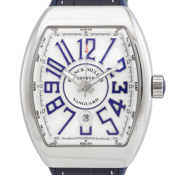 Stainless steel case with a blue rubber strap. Fixed stainless steel bezel. White dial with luminous silver-tone hands and Arabic numeral hour markers. Minute markers. 360 degree (compass) markings around the outer rim. Dial Type: Analog. Luminescent hands and markers. Date display at the 6 o'clock position. Automatic movement. Scratch resistant sapphire crystal. Screw down crown. Solid case back. Tonneau case shape. Case size: 45 mm. Case thickness: 13 mm. Band width: 27 mm. Band length: 8 inches. Deployment clasp with a push button release. Water resistant at 30 meters / 100 feet. Functions: date, hour, minute, second, compass. Vanguard Series. Luxury watch style. Watch label: Swiss Made. Franck Muller Vanguard Automatic White Dial Men's Watch 45SCWHTWHTBLU-3.