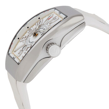 Silver-tone stainless steel case with a white rubber strap. Fixed silver-tone stainless steel bezel. White dial with silver-tone hands and Arabic numeral hour markers. Minute markers around the outer rim. Dial Type: Analog. Luminescent hands and markers. Date display at the 6 o'clock position. Automatic movement. Scratch resistant sapphire crystal. Screw down crown. Solid case back. Tonneau case shape, case size: 45 mm, case thickness: 13 mm. Band width: 27 mm, band length: 8 inches. Deployment with push button release clasp. Functions: date, hour, minute, second. Vanguard Series. Luxury watch style. Watch label: Swiss Made. Franck Muller Vanguard Automatic White Dial Men's Watch 45SCWHTWHTWHT-1.