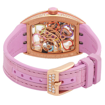 18kt rose gold case with a pink leather and rubber strap. Fixed bezel with diamond set. Skeleton dial. Dial Type: Analog. Luminescent hands. Hand wind movement. Scratch resistant sapphire crystal. Transparent case back. Tonneau case shape, case size: 32 mm. Buckle clasp. Water resistant at 30 meters / 100 feet. Functions: hour, minute. Vanguard Heart Skeleton Series. Luxury watch style. Watch label: Swiss Made. Item Variations: V 32 S6 SQT HEART D COL DR 5N RS 5N. Franck Muller Vanguard Heart Skeleton Hand Wind Diamond Ladies Watch.