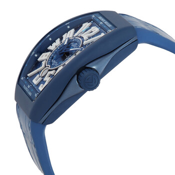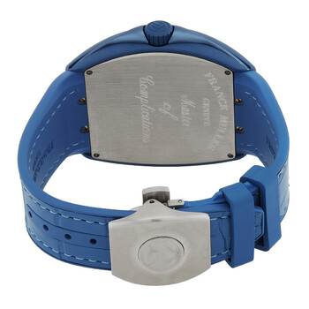 Blue stainless steel case with a blue leather strap. Fixed blue stainless steel bezel. Blue dial with blue hands and Arabic numeral hour markers. Minute markers around the outer rim. Dial Type: Analog. Luminescent hands and markers. Date display at the 6 o'clock position. Automatic movement. Scratch resistant sapphire crystal. Tonneau case shape, case size: 44 mm. Functions: date, hour, minute, second. Additional Info: original box, manual (complete accessories). Vanguard Mariner Series. Luxury watch style. Watch label: Swiss Made. Franck Muller Vanguard Mariner Automatic Blue Dial Men's Watch V45YTSCDTMARCRMRCR(BLBLCBLC).