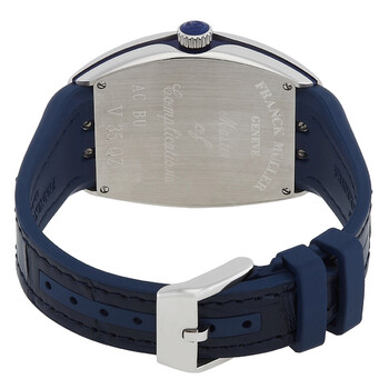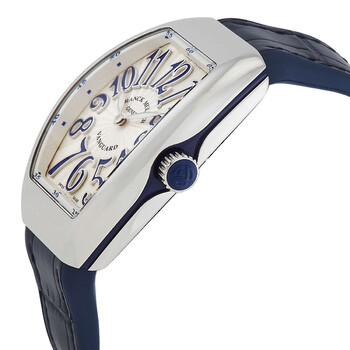 Silver-tone stainless steel case with a blue rubber strap. Fixed silver-tone stainless steel bezel. Silver-tone dial with silver-tone hands and Arabic numeral hour markers. Dial Type: Analog. Luminescent hands and markers. Franck Muller Calibre FM 1321-QZ quartz movement. Scratch resistant sapphire crystal. Pull / push crown. Solid case back. Tonneau case shape, case size: 35 mm, case thickness: 10.4 mm. Band width: 22 mm, band length: 7 inches. Tang clasp. Water resistant at 30 meters / 100 feet. Functions: hour, minute. Additional Info: quartz frequency set at 32,768 alternations per hour. Vanguard Series. Luxury watch style. Watch label: Swiss Made. Franck Muller Vanguard Quartz Silver Dial Ladies Watch 35QZBLUSILBLU.