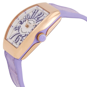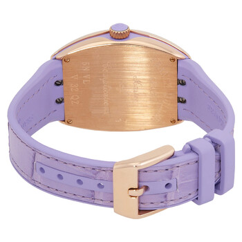 18kt rose gold case with a purple alligator leather strap. Fixed 18kt rose gold bezel. White dial with gold-tone leaf-style shape hands and Arabic numeral hour markers. Dial Type: Analog. Quartz movement. Scratch resistant sapphire crystal. Screw down crown. Solid case back. Tonneau case shape. Case size: 32 mm. Pin buckle clasp. Water resistant at 30 meters / 100 feet. Functions: hour, minute. Luxury watch style. Watch label: Swiss Made. Franck Muller Vanguard Quartz White Dial Ladies Watch V 32 QZ (5N.VL).