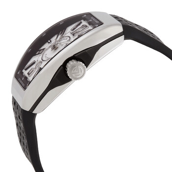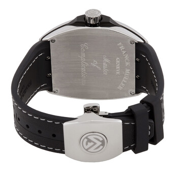 Silver-tone stainless steel case with a black rubber strap. Fixed silver-tone stainless steel bezel. White dial with silver-tone hands and Arabic numeral hour markers. Minute markers around the outer rim. Dial Type: Analog. Luminescent hands and markers. Date display at the 6 o'clock position. Automatic movement. Scratch resistant sapphire crystal. Solid case back. Tonneau case shape, case size: 44 mm, case thickness: 14 mm. Band width: 27 mm, band length: 8 inches. Buckle clasp. Water resistant at 30 meters / 100 feet. Functions: date, hour, minute, second. Vanguard Racing Series. Luxury watch style. Watch label: Swiss Made. Franck Muller Vanguard Racing Automatic White Dial Men's Watch 45SCRACINGWHT.