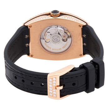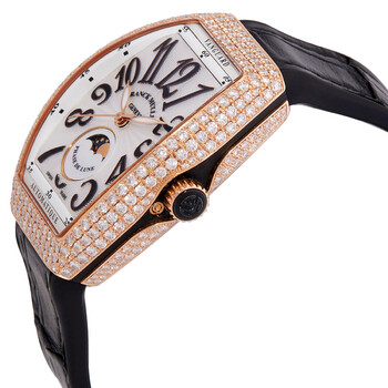 18kt rose gold case with a black leather strap. Fixed 18kt rose gold set with diamonds bezel. White dial with Arabic numeral hour markers. Dial Type: Analog. One subdial displaying: moonphase. Automatic movement. Scratch resistant sapphire crystal. Transparent see through case back. Tonneau case shape, case size: 32 mm. Tang clasp. Functions: hour, minute, second. Vanguard Series. Luxury watch style. Watch label: Swiss Made. Franck Muller Vanguard White Dial Unisex Watch V32SCATFOLD(5NNR).