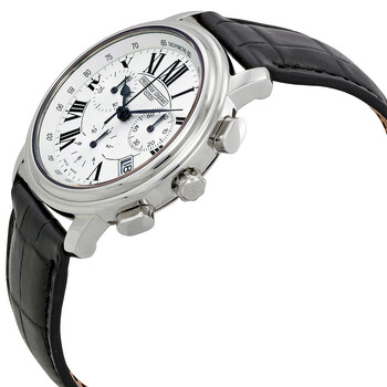 Stainless steel case with a black leather strap. Fixed stainless steel bezel. White dial with Roman numeral hour markers. Minute markers. tachymeter markings around the outer rim. Dial Type: Analog. Date display at the 4 o'clock position. Chronograph - three sub-dials displaying: 60 second, 30 minute and 12 hour. Quartz movement. Scratch resistant sapphire crystal. Solid case back. Case size: 38 mm. Round case shape. Tang clasp. Water resistant at 60 meters / 200 feet. Functions: chronograph, tachymeter,date, hour, minute, second. Luxury watch style. Watch label: Swiss Made. Frederique Chronograph White Dial Men's Watch FC-292S3P6.