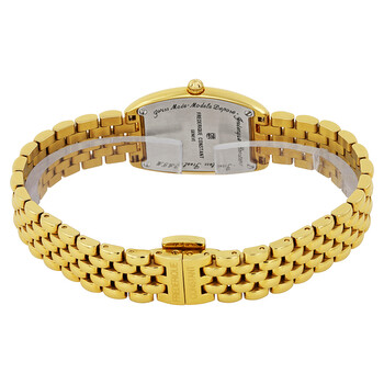 Gold-tone stainless steel case and bracelet. Fixed gold-tone bezel. White / silver guilloche dial with black hands and Roman numeral hour markers. Minute markers around the outer rim. Dial Type: Analog. Seconds sub-dial above the 6 o'clock position. Frederique Constant calibre FC-235 quartz movement. Scratch resistant sapphire crystal. Solid case back. Case dimensions: 30.5 mm x 21.5 mm. Tonneau case shape. Band width: 14 mm. Deployment clasp with a push button release. Water resistant at 30 meters / 100 feet. Functions: hour, minute, second. Casual watch style. Watch label: Swiss Made. Frederique Constant Art Deco Ladies Watch 235M1T25B.