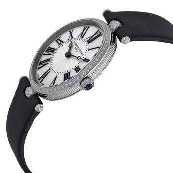 Stainless steel case with a black satin strap. Fixed stainless steel bezel. Silver dial with black hands and Roman numeral hour markers. Minute markers around an inner ring. Dial Type: Analog. Quartz movement. Scratch resistant sapphire crystal. Pull / push crown. Solid case back. Case dimensionsr: 24.5 mm x 30 mm. Case thickness: 7 mm. Oval case shape. Band width: 14 mm. Tang clasp. Water resistant at 30 meters / 100 feet. Functions: hour, minute. Dress watch style. Watch label: Swiss Made. Frederique Constant Art Deco Silver Dial Ladies Watch 200MPW2VD6